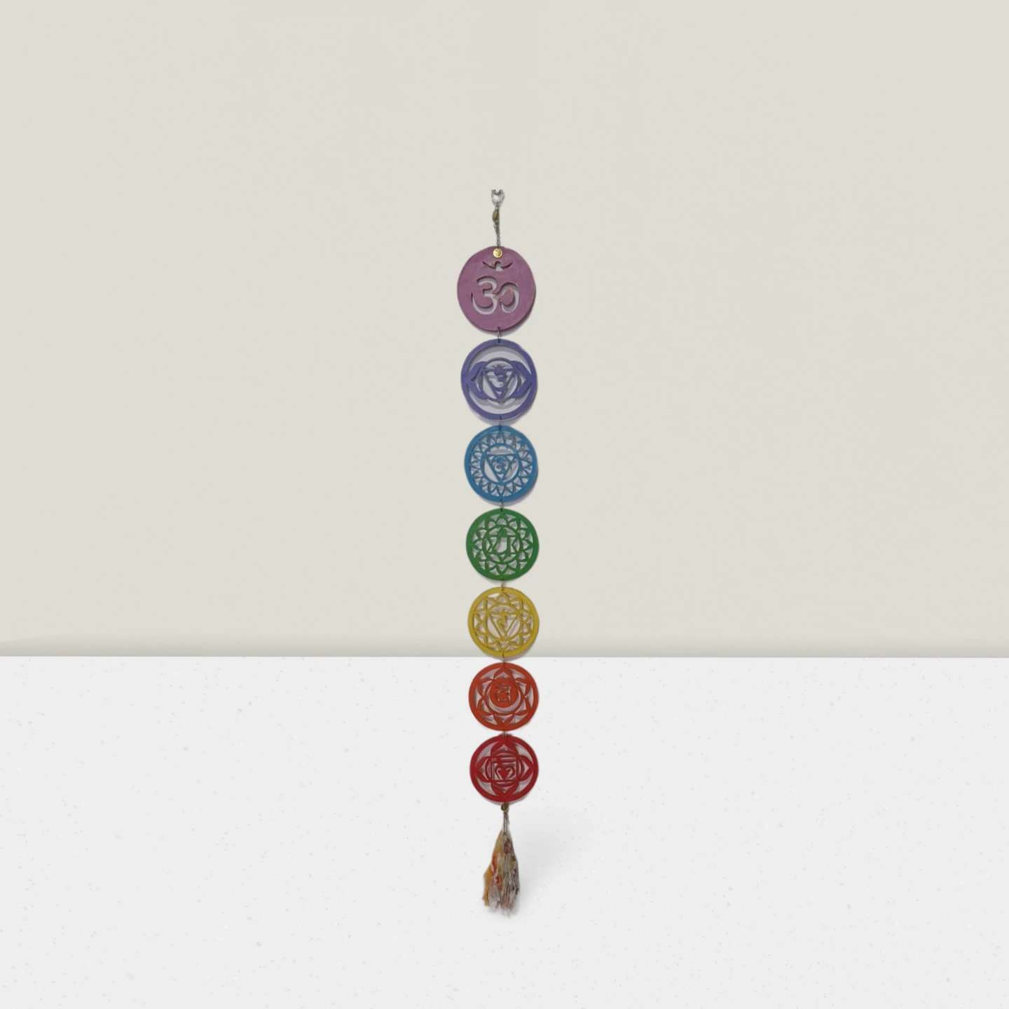 Este colgante de los 7 chakras está diseñado para armonizar y equilibrar las energías de tu hogar. Cada uno de los chakras representados en el colgante corresponde a un centro energético en el cuerpo, desde el chakra raíz hasta el chakra corona. Al colgarlo en tu espacio, ayudas a mantener el flujo energético en equilibrio, promoviendo bienestar, serenidad y claridad mental.
