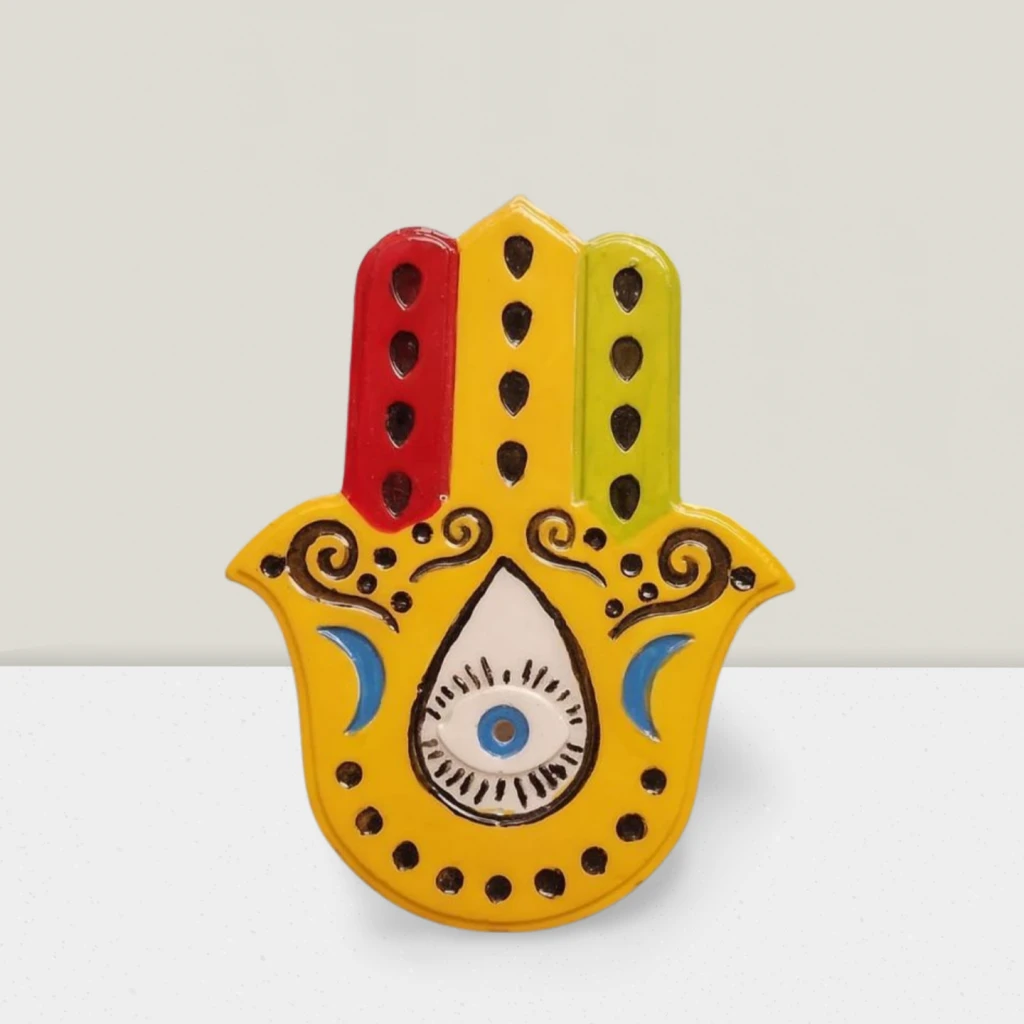 La Mano de Fátima es un símbolo antiguo de protección, usado en diversas culturas y religiones, incluyendo el Islam, el judaísmo y el cristianismo. Se cree que protege contra el mal de ojo y trae buena suerte, salud y felicidad. La mano abierta simboliza la defensa contra las energías negativas, mientras que el ojo en el centro es un talismán contra el mal de ojo. Es un símbolo de poder y fuerza, que también se asocia con bendiciones y poder.